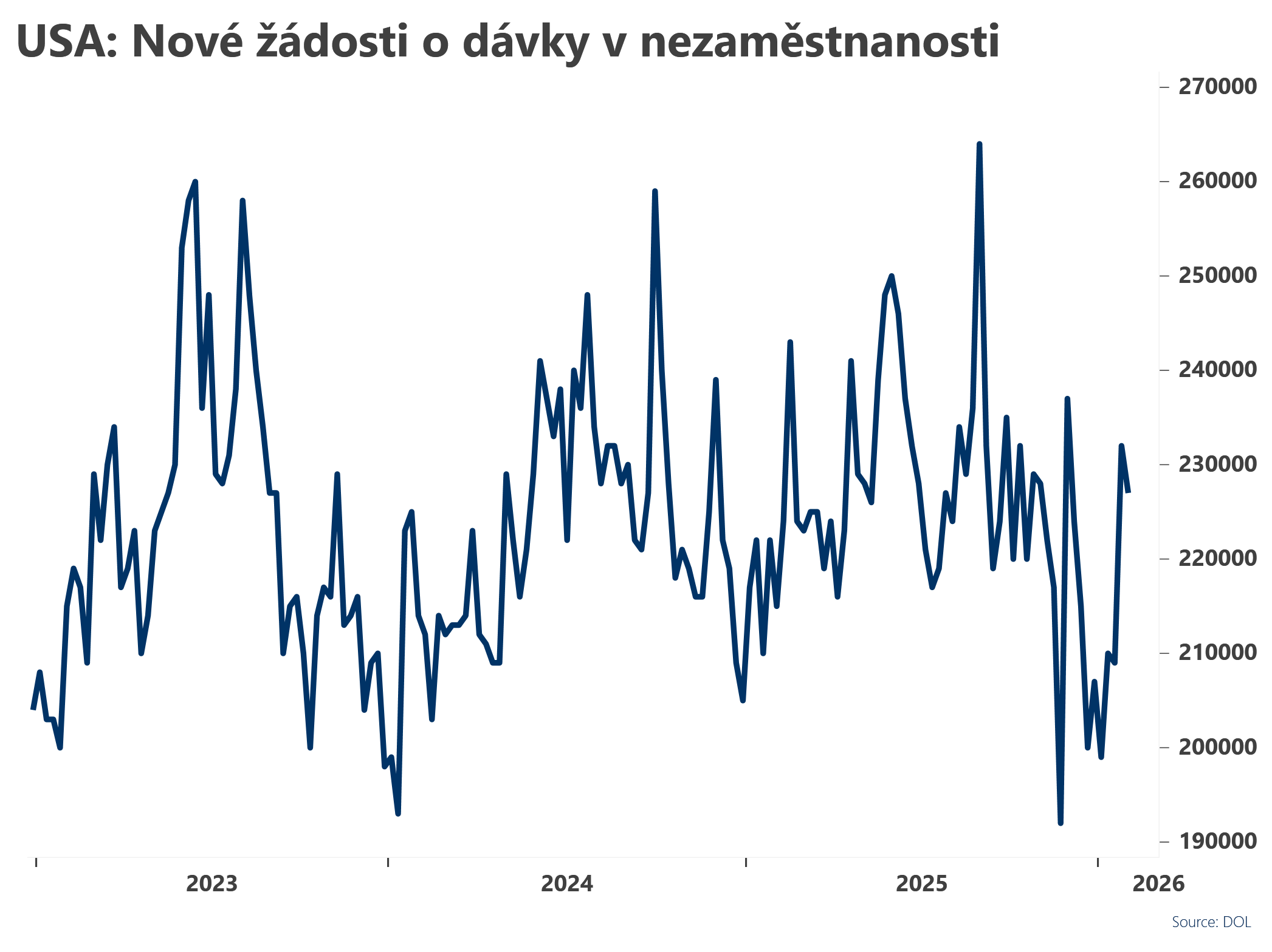 Počet nových žádostí o dávky v nezaměstnanosti v minulém týdnu klesl na 227 tis. oproti revidovaným 232 tis. v předminulém týdnu. Trhy očekávaly pokles na 223 tis. nových žádostí.
