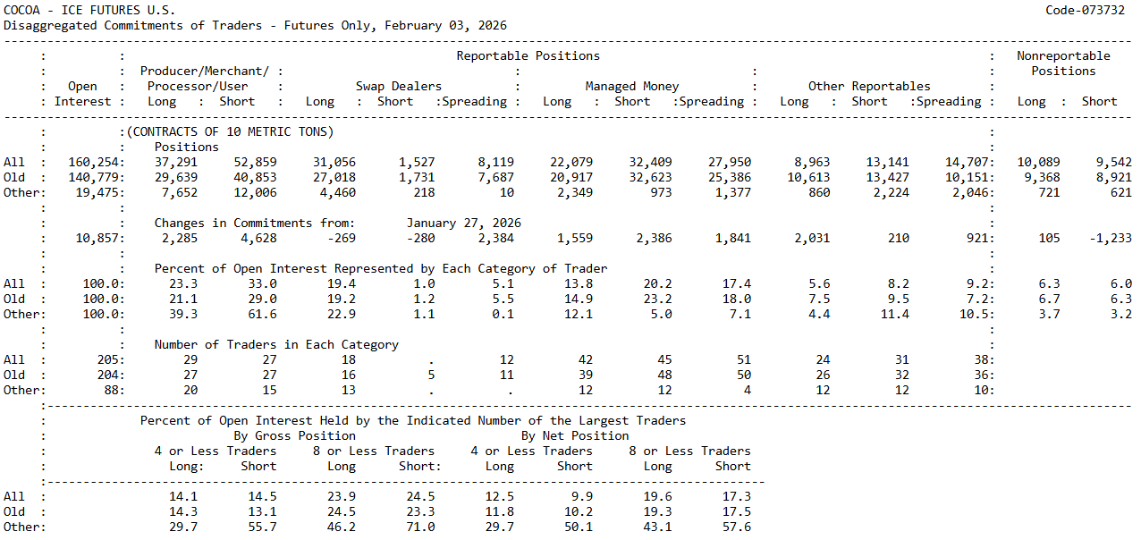 Nejnovější zpráva COT pro kakao (ICE Futures U.S., k 3. únoru 2026) ukazuje zřetelný nárůst aktivity a prohlubující se rozdíl mezi komerčními účastníky a spekulativním kapitálem. Otevřený zájem vzrostl o 10 857 kontraktů na 160 254, což naznačuje přítok nového kapitálu a rostoucí angažovanost ve stávajícím trendu. Klíčové body:
