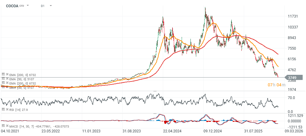 Futures na kakao na burze ICE (COCOA) dnes dosahují nejnižších úrovní od začátku října 2023, pod tlakem slábnoucí poptávky a rostoucí nabídky v klíčových producentských regionech. Data ukazují na rostoucí zásoby u dvou největších exportérů: Ghany a Pobřeží slonoviny. Údaje z Pobřeží slonoviny ukazují, že k 8. únoru kumulativní přístavy příjezdy/expedice od začátku sezóny 2025/26 (od 1. října) meziročně klesly o 4,5 % na 1,263 mil. tun. Celkově to výrazně zhoršuje fundamenty kakaa a v kombinaci s příznivými předpověďmi počasí v západní Africe to spustilo širokou likvidaci dlouhých pozic. Ceny dnes klesají k úrovni 3 750 USD za tunu.
