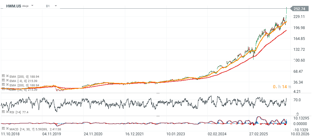 Howmet Aerospace (HWM.US) stojí v centru jednoho z nejsilnějších růstových cyklů v oblasti aerospace & defense za poslední roky. Společnost dosáhla meziročního celkového výnosu přes 80 % a její nejnovější čtvrtletní výsledky tento trend dále podpořily. Fundamenty zůstávají silné: cash flow roste, rozvaha je disciplinovaná a trh aktuálně oceňuje téměř bezchybnou realizaci růstové strategie.
