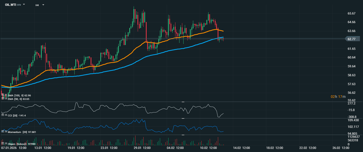 Na grafu ropy WTI sledujeme postupné oslabení po předchozím růstovém impulzu. Cena se aktuálně pohybuje kolem 62,77 USD za barel a dostává se do těsného kontaktu s klouzavými průměry. EMA 50 (oranžová) se nachází přibližně na 63,65 USD, zatímco SMA 100 (modrá) leží poblíž 62,96 USD. Aktuální cena se tak pohybuje pod EMA 50 a v blízkosti SMA 100, což naznačuje ztrátu krátkodobé býčí dynamiky. Po silném růstu z oblasti 57 USD došlo na přelomu ledna a února k vytvoření lokálního maxima nad 65 USD. Od té doby trh přešel do konsolidace a nyní vytváří mírně sestupnou strukturu nižších maxim. Pokud by došlo k jasnému průrazu pod SMA 100, mohl by se otevřít prostor pro hlubší korekci směrem k oblasti 61,50–60,50 USD, kde se nacházela předchozí konsolidační zóna. CCI se pohybuje kolem hodnoty -141, tedy v pásmu přeprodanosti, což může signalizovat možnost krátkodobého technického odrazu. Naopak Momentum klesá a potvrzuje slábnoucí nákupní sílu.