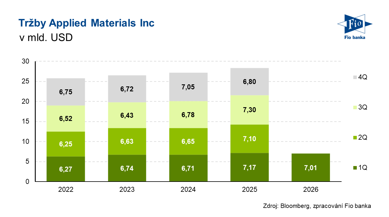 Klíčová slova: Analytik | Akcie | Bloomberg | Dividendový výnos | Marže | P/E | Ukazatel | Výnos | Zisk na akcii | USD | Obchodování | JPMorgan | Morgan Stanley | Zisk | Výsledky | EPS | Analytika | Banka | Fio banka | Cena | Fio | Cílová cena | Hrubá marže | ROCE | Tržby | Citi | Zajištění | Kapitalizace | Výhled | Konsensus | Očekávání | Odhady analytiků | Čistý zisk | Firma | Applied Materials | Generální ředitel | Vyšetřování | Průmysl | Hospodaření | Výsledky hospodaření | Solidní výsledky | Prezident | Pokles | Finanční ředitel | Americká společnost | Vývoj | Viceprezident | Růst | Bezpečnost | Růst tržeb | Dodavatelský řetězec | AI | AMAT | Applied Materials | Odvětví | Společnosti | Růst trhu | Společnost | Výsledky společnosti | 3М | Řetězec | Konkurent | Polovodiče | Vice | Společnost Applied Materials | Očištěný zisk na akcii | Fio banka, a.s. | Zařízení | Applied Materials (AMAT) | Research | Michal Šnobl | Rok 2026 |