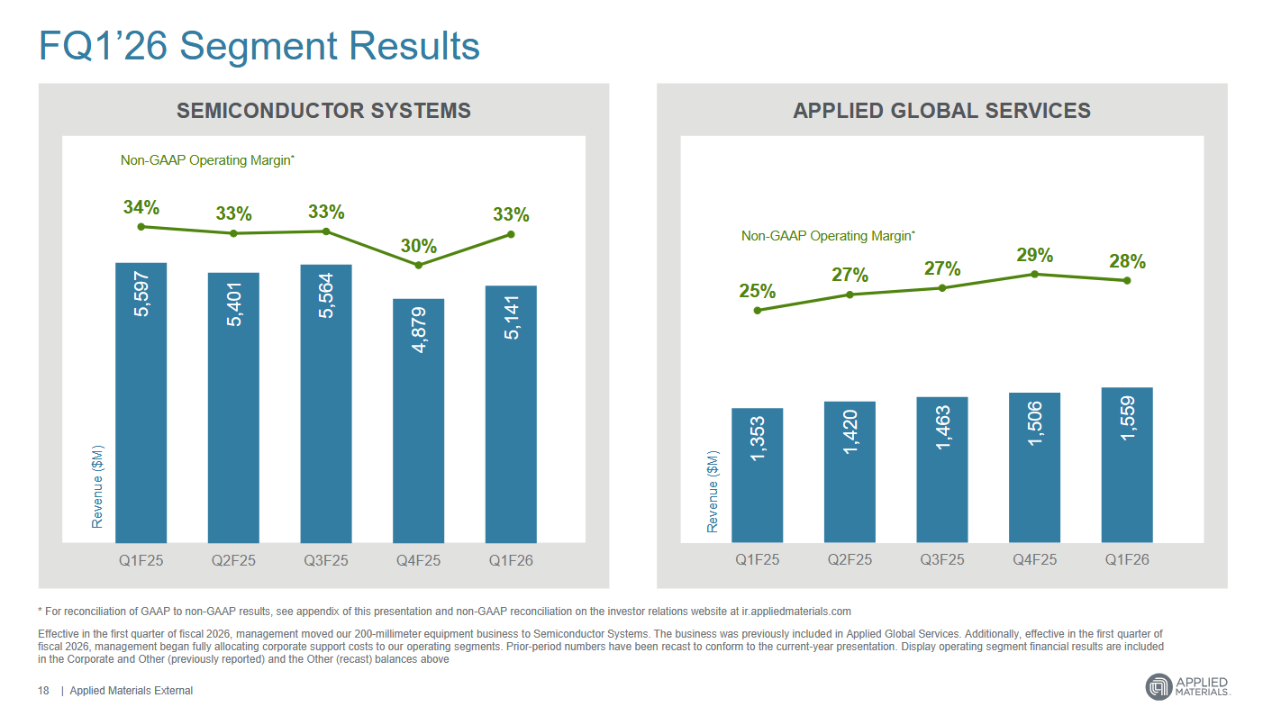Segment polovodičových systémů vykázal tržby ve výši 5,14 mld. USD, což představuje meziroční pokles o 8,15 % a mírně nad tržním konsensem 5,03 mld. USD. Segment globálních služeb dosáhl tržeb 1,56 mld. USD, tedy o 15,23 % více než před rokem, a rovněž mírně nad očekáváním trhu (1,54 mld. USD).