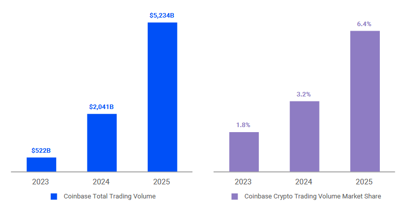 Objem obchodování Coinbase v roce 2025 vzrostl meziročně o 156 %, tržní podíl se zdvojnásobil