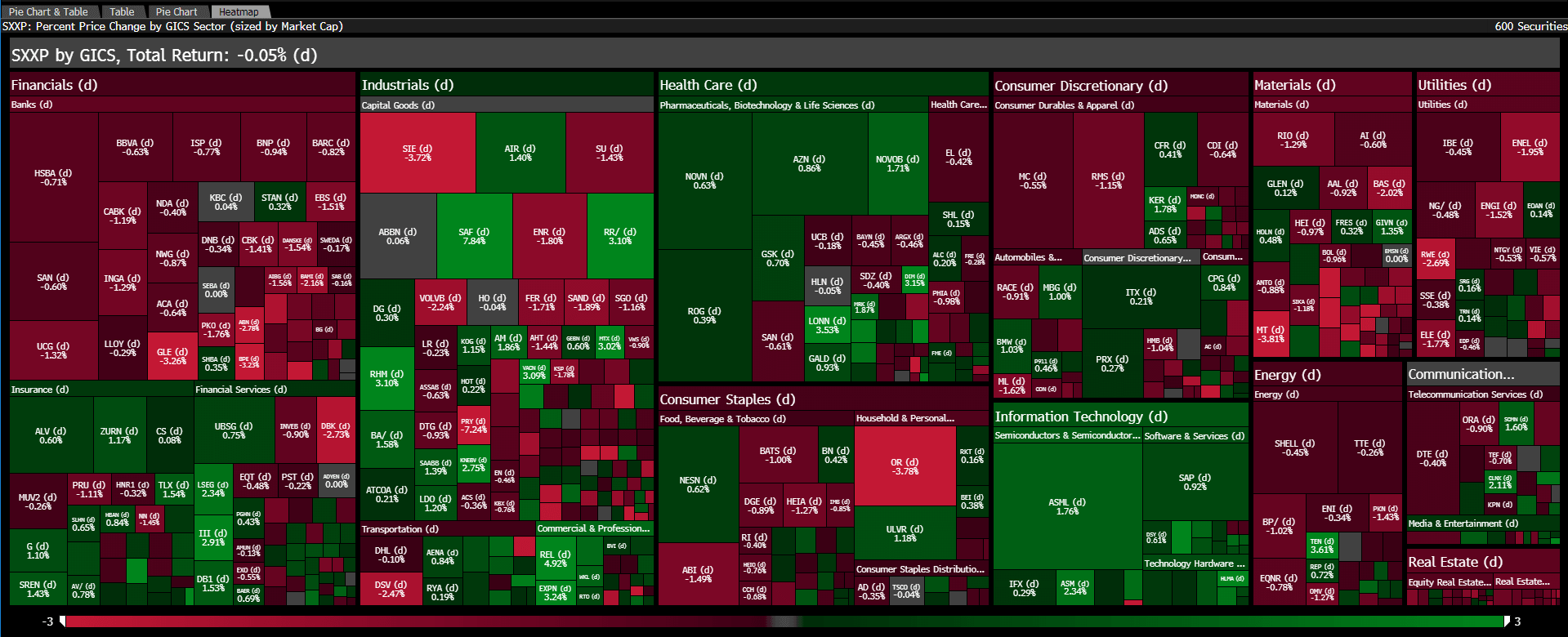 Dnešní výkonnost akcií a sektorů indexu Stoxx 600. Zdroj: Bloomberg Finance LP