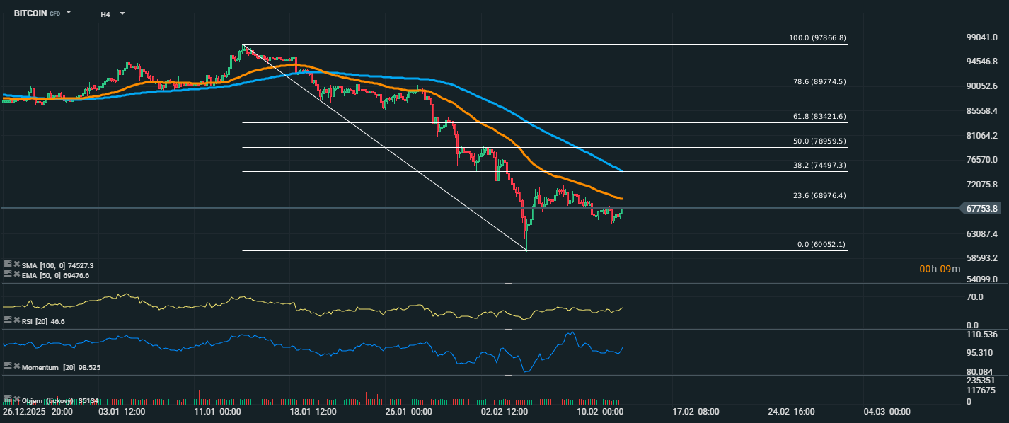 Bitcoin se aktuálně obchoduje kolem 67 750 USD a po prudkém výprodeji z oblasti téměř 98 000 USD přešel do fáze konsolidace. Cena se aktuálně drží nad lokálním minimem kolem 60 050 USD. Technicky je trh stále v medvědí struktuře. Cena se nachází pod EMA 50 (69 476 USD) i výrazně pod SMA 100 (74 527 USD), přičemž oba klouzavé průměry mají klesající sklon. To potvrzuje přetrvávající tlak prodejců. Nejbližší rezistence se nachází u 23,6 % Fibonacciho hladiny (68 976 USD), nad kterou se trh zatím nedokázal stabilně prosadit. RSI (46) se pohybuje v neutrálním pásmu a naznačuje určité uklidnění po předchozím přeprodaném stavu. Momentum se mírně zlepšuje, což může krátkodobě podpořit pokus o růstovou korekci, nicméně celková struktura zůstává slabá.