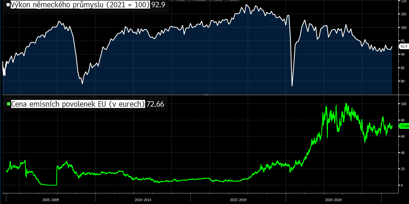 Česku hrozí fatální deindustrializace, jaká v minulých letech postihla Británii, Francii, Itálii, nebo která probíhá už i v Německu. V Německu jsou problémy průmyslu patrné zvláště zrovna od doby, kdy na sklonku minulého desetiletí citelně vyskočila cena emisních povolenek (viz graf Bloombergu níže). Netřeba dodávat, že strasti německého průmyslu jsou dalším ze zdrojů dýchavičnosti toho českého.