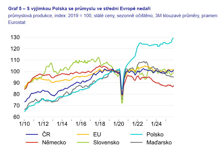 Částečně je ústup tradičního průmyslu nevyhnutelným vyústěním technologického posunu vpřed, částečně ovšem důsledkem zeleného mámení evropských elit. Ilustruje to i nově vydaná Zpráva o měnové politice z pera České národní banky. Polský průmysl ve 20. letech podle ní podává suverénně nejlepší výkon široko daleko (viz graf ČNB níže). Zatímco průmysl EU jako celku od roku 2019 klopýtá kolem nuly, podobně jako ten český, polský ve stálých cenách zvýšil svůj výkon o zhruba 30 procent. Německý průmysl se za stejnou dobu propadá o více než desetinu, což znamená, že zejména právě Polsko v tomto desetiletí výrazně stáhlo jeho náskok. To Polsko, které zůstává při špinavém uhlí, jak dlouho je to jen možné. To Polsko, které uhlím zásobuje i Česko – ještě více nyní, když je v tuzemsku s jeho těžbou šmytec. To Polsko, které nepodlehlo protijadernému šílení jako Německo.