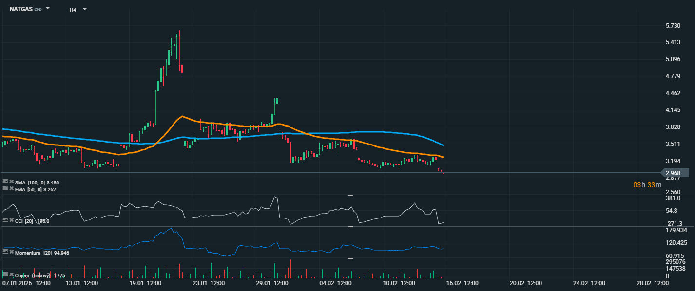 Cena zemního plynu pokračuje v poklesu a aktuálně se pohybuje těsně nad úrovní 2,97 USD. Trh se dostal na nejnižší hodnoty za poslední měsíce, čímž potvrzuje silný medvědí sentiment, který navazuje na fundamentální tlak v podobě teplejšího počasí a slabší očekávané poptávky po vytápění. Cena se nachází výrazně pod klouzavými průměry – EMA 50 (3,26 USD) i SMA 100 (3,48 USD) směřují dolů, což potvrzuje převahu prodejců a pokračující klesající trend. Každý pokus o růst je zatím rychle vyprodán a trh vytváří nižší maxima i nižší minima. CCI se pohybuje v negativním pásmu a signalizuje zvýšený prodejní tlak, přičemž zatím nedochází k výraznějšímu obratu. Momentum rovněž zůstává utlumené a nepoukazuje na sílící nákupní aktivitu.