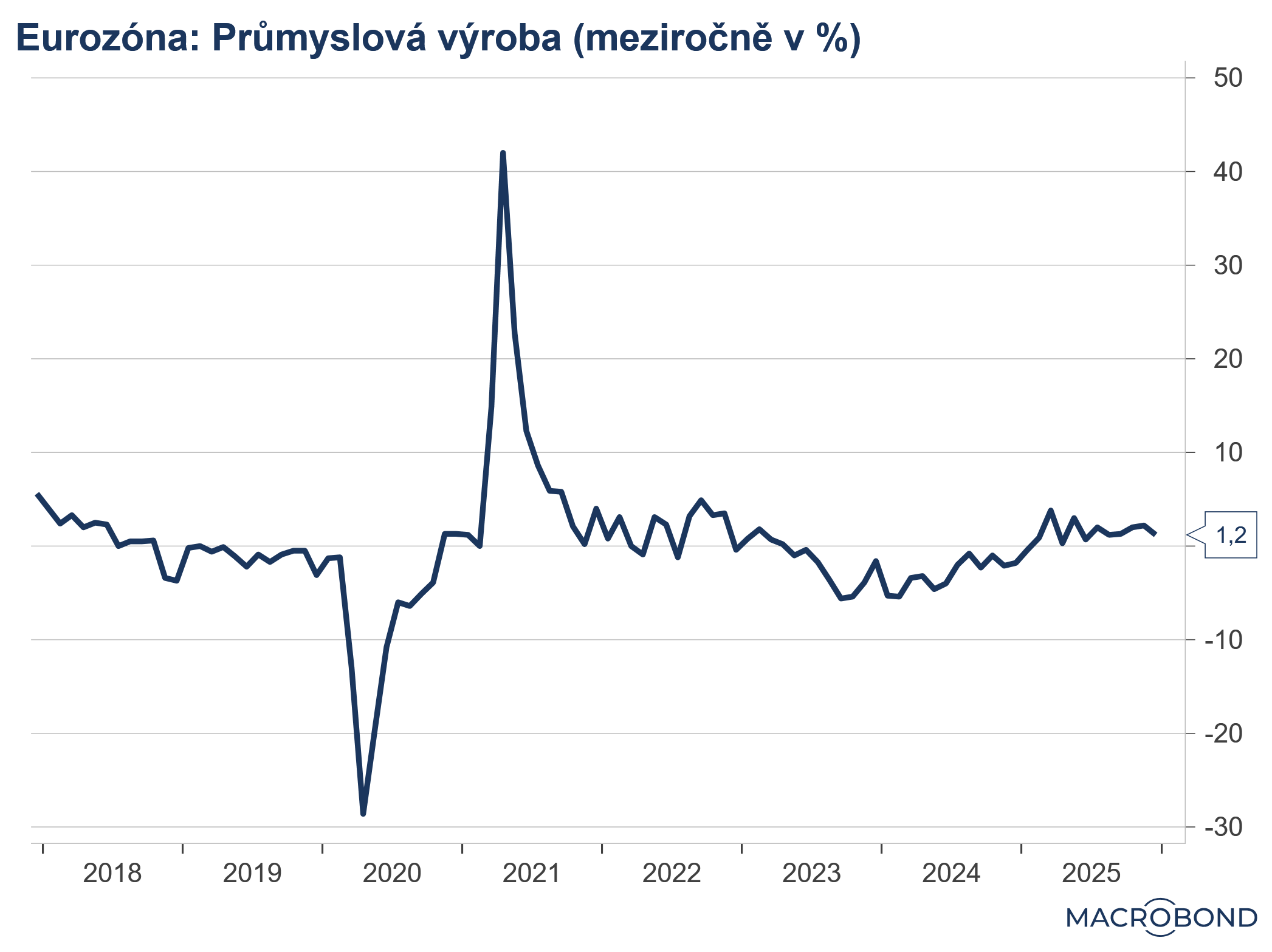 Průmyslová výroba v listopadu zpomalila na -1,5 % meziročně oproti revidovaným 0,2 % v říjnu. Trhy očekávaly 1,2 % meziročně. -