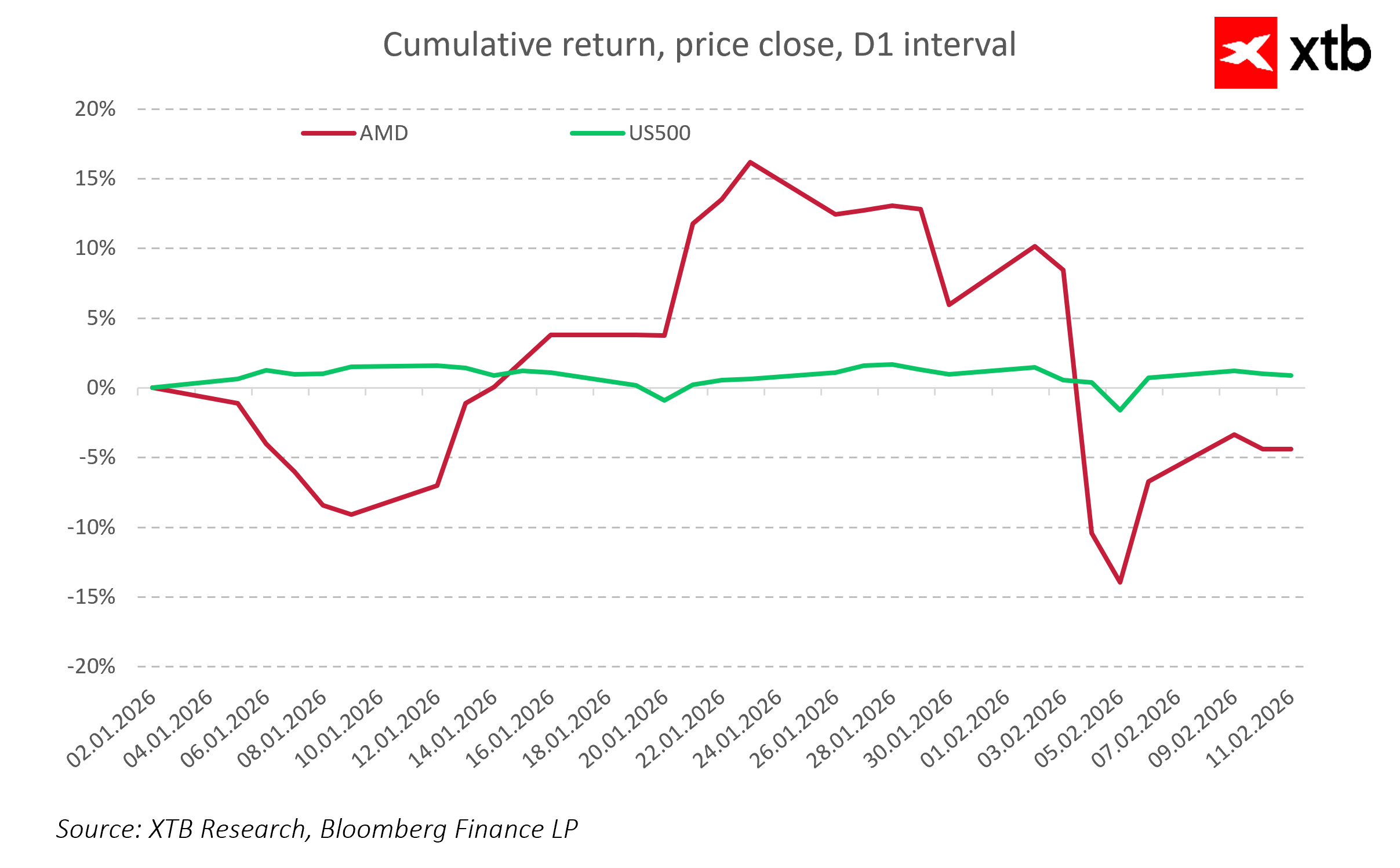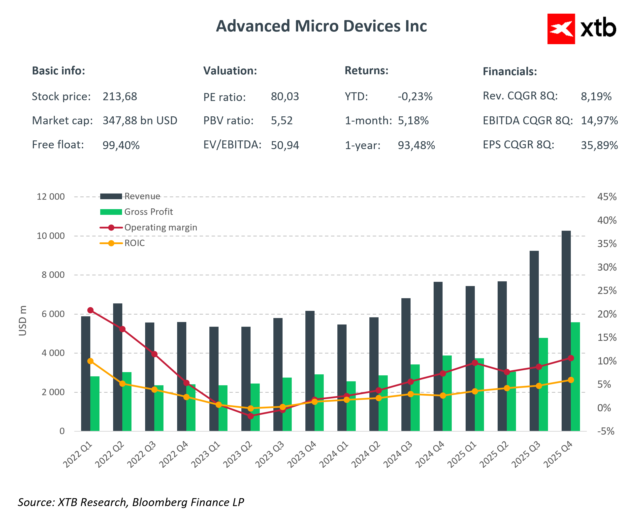 Americká technologická společnost AMD, která navrhuje čipy, zveřejnila výsledky hospodaření za čtvrtý kvartál roku 2025. Tržby i očištěný zisk na akcii překonaly očekávání. Přestože výhled pro 1Q byl nad odhady, tak se někteří analytici domnívají, že investoři očekávali více. -