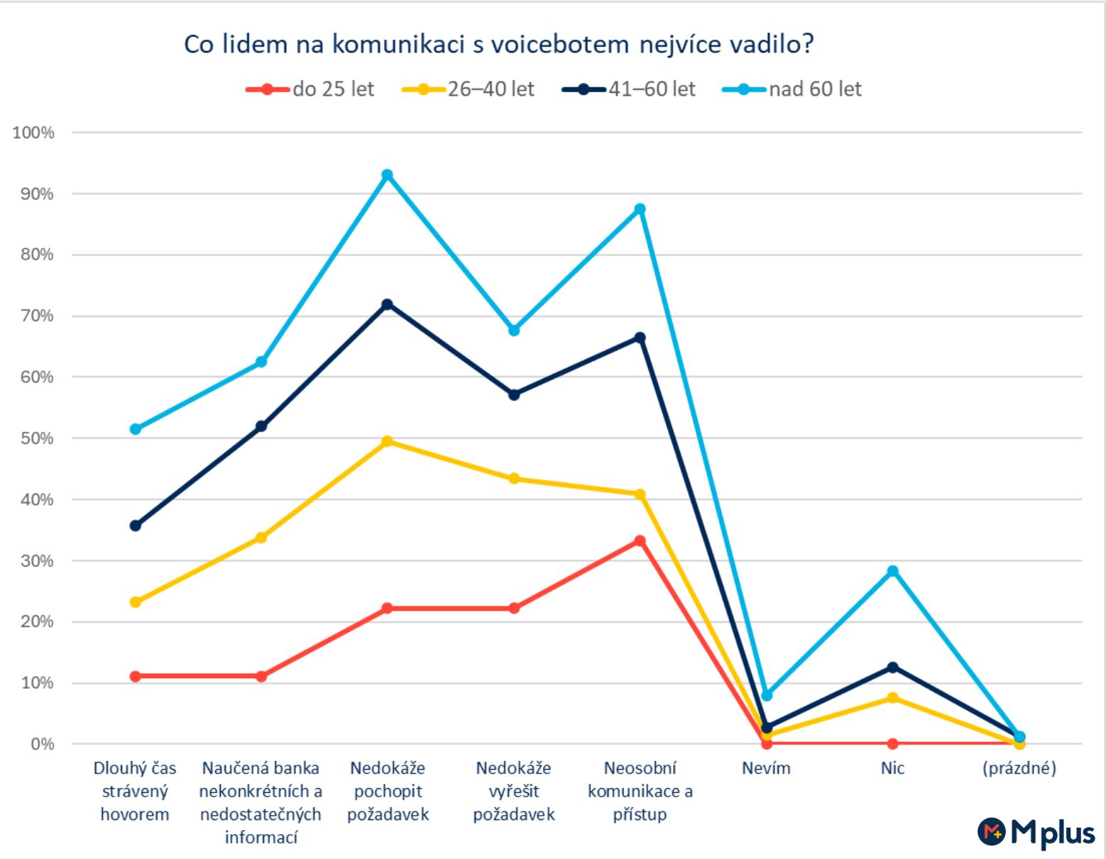 Negativní. Tak popisují Češi nejčastěji svou zkušenost s voiceboty na zákaznických linkách. Hodnocení přitom nezávisí na věku, voiceboty nevyhledávají ani mladí, ani starší lidé, jak ukázal průzkum společnosti Mplus Czechia. Více než polovina Češek a Čechů se zlobí, když jim voiceboti nerozumí (60 %), druhým nejčastějším důvodem rozladění je neosobní komunikace a přístup (53 %). Pokud zákazníci něco oceňují, je to rychlost AI řešení. Vždy ale raději mluví s člověkem.