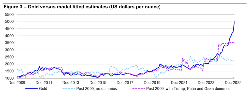 Nicméně ani tento rozšířený model („Post-2009 with Trump, Putin and Gaza dummies“) nedokáže plně vysvětlit nedávný prudký růst ceny zlata. Ke konci ledna 2026 model implikoval cenu přibližně 3 500 USD, tedy výrazně pod skutečnou tržní úrovní. Jinými slovy, současnou cenu zlata považuji za obtížně obhajitelnou i při zohlednění geopolitických faktorů. To samozřejmě neznamená, že cena nemůže dále růst — pouze by bylo velmi obtížné takový vývoj fundamentálně vysvětlit.