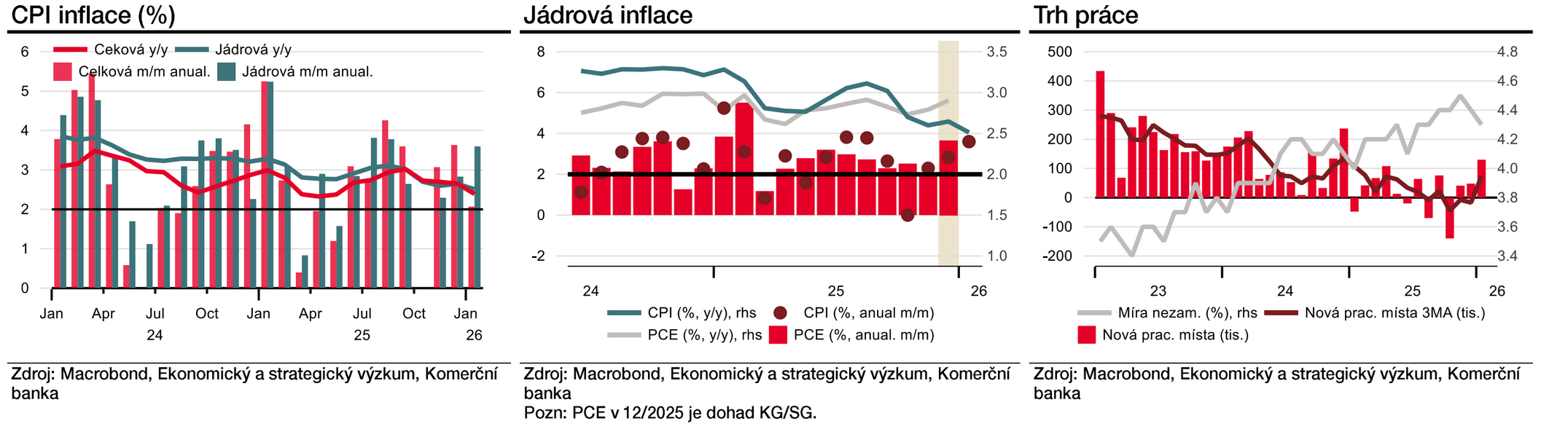 Koncem minulého týdne zveřejněná lednová inflace v USA se sice snížila na 2,4 procenta meziročně. V rámci struktury však meziměsíční jádrová inflace dále zrychluje a v anualizovaném vyjádření dosáhla 3,6 procenta. Z pohledu Fedu navíc není primárním ukazatelem cenových tlaků v ekonomice změna indexu spotřebitelských cen, nýbrž deflátor soukromé spotřeby. A ten roste ještě o něco výrazněji. V pátek bude zveřejněna jeho prosincová hodnota a my i tržní konsenzus očekáváme zvýšení meziměsíční dynamiky jeho jádrové složky na 0,3 procenta (nejvyšší od února 2025) a té meziroční na 2,9 procenta.