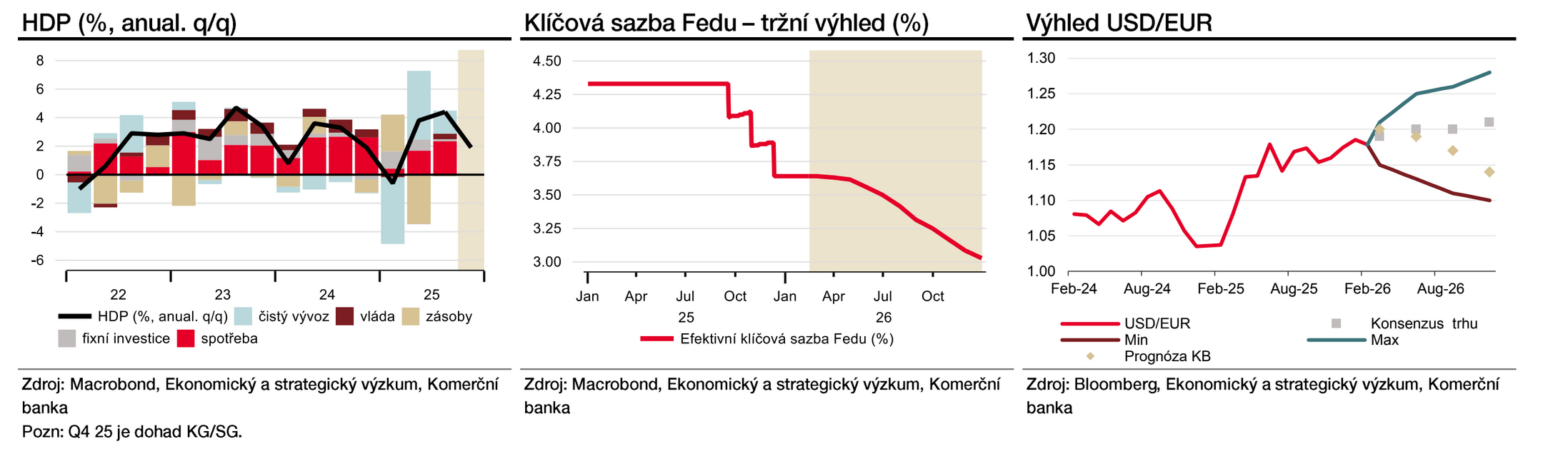 Kromě toho v rámci svého duálního mandátu sleduje americká centrální banka také reálnou ekonomiku. Trh práce se po ochlazení v průběhu loňského roku na začátku toho letošního zhruba stabilizoval. Lednový počet nových pracovních míst dokonce výrazně předčil očekávání finančních trhů. Žádosti o podporu v nezaměstnanosti zůstávají z historického pohledu nízko. Americká ekonomika jako celek sice patrně ve čtvrtém čtvrtletí vykáže citelné snížení své mezičtvrtletní dynamiky, to ale bude dáno zejména loňským shutdownem. Fundamentální růst americké ekonomiky naopak zůstává silný a letos ho podpoří i fiskální stimul. Za celý letošní rok by tak podle našeho odhadu měl americký HDP přidat 2,5 procenta.
