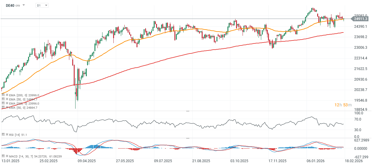 Nálada na evropských trzích je převážně optimistická, tři hlavní indexy – FTSE, DAX a CAC40 – zaznamenávají mírné zisky; akcie komoditního sektoru si vedou obzvláště dobře. Současně futures na americké indexy naznačují nižší otevření na Wall Street, přičemž US500 a US100 klesly přibližně o -0,1 % až -0,3 %.