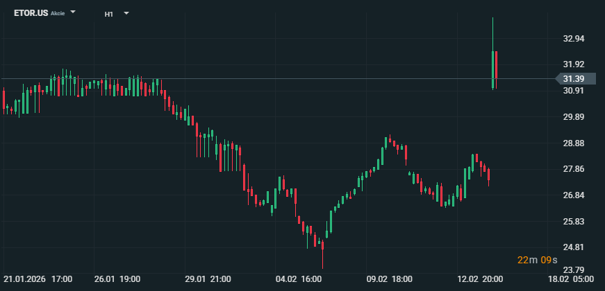 V posledním dostupném quote feedu se ETOR obchodoval okolo 31,84 USD, přibližně +15,95 % v rámci dne, což odpovídá pohybu „o více než 14 %“. Zdroj: xStation5