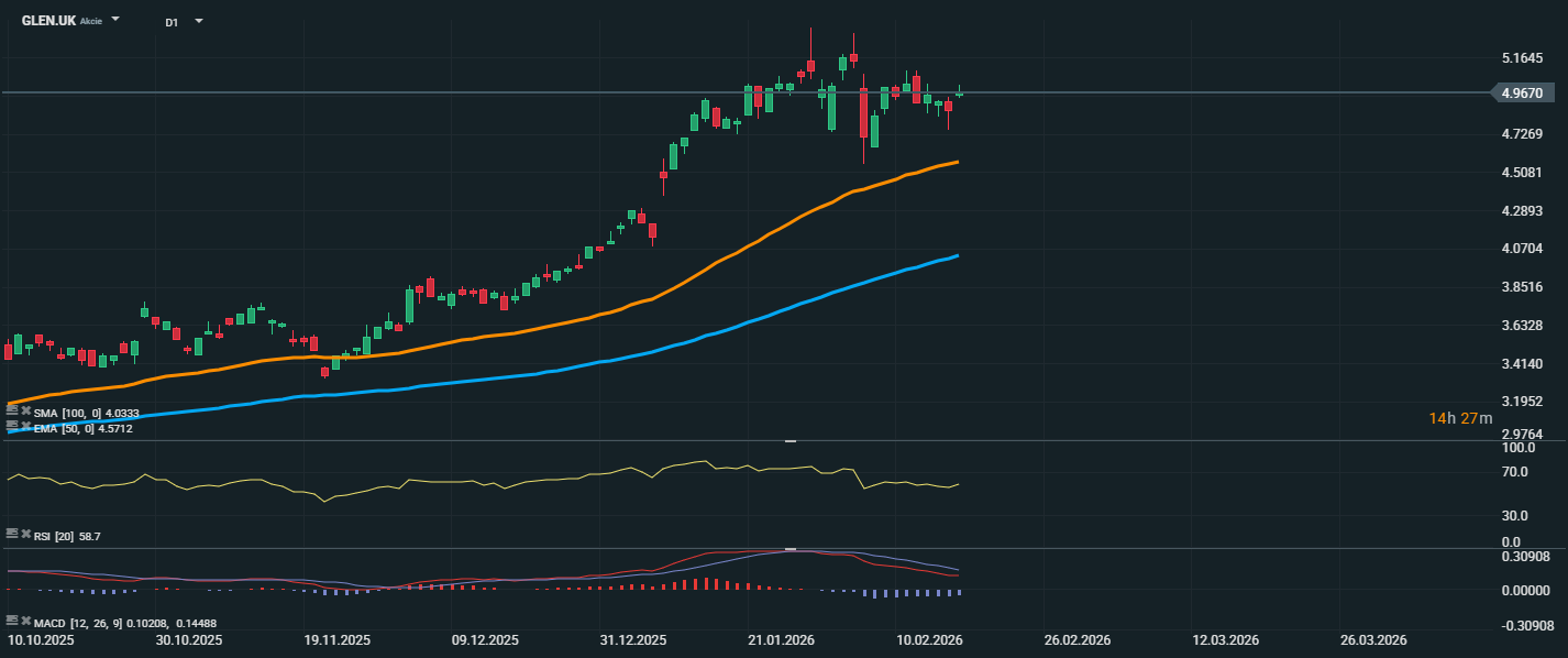Akcie společnosti Glencore Plc se obchodují v blízkosti úrovně 4,97 GBP a pohybují se těsně pod lokální rezistencí kolem 5,16 GBP. Cena se drží nad EMA 50 (4,57 GBP) i nad SMA 100 (4,03 GBP), přičemž oba průměry mají rostoucí sklon. To potvrzuje střednědobé býčí nastavení trhu. EMA 50 aktuálně funguje jako dynamická podpora, zatímco SMA 100 představuje silnější technickou základnu v případě hlubší korekce. Z technického pohledu je klíčové sledovat oblast 5,16 GBP, kde se nachází aktuální rezistence. Její průraz by mohl otevřít prostor k dalšímu posunu směrem k 5,40–5,60 GBP. Naopak při neúspěšném pokusu o průraz lze očekávat návrat k podpoře kolem 4,57 GBP (EMA 50), případně hlouběji k 4,30 GBP, kde se nachází předchozí konsolidační pásmo.
