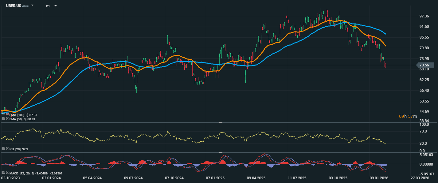Akcie společnosti Uber Technologies Inc. se pohybují kolem úrovně 70,56 USD a pokračují v výrazné korekci z maxim poblíž 97 USD. Prodejní tlak je v posledních týdnech dominantní a akcie se nachází na nejnižších hodnotách za několik měsíců. Cena se propadla pod EMA 50 (80,81 USD) i pod SMA 100 (87,37 USD), přičemž oba klouzavé průměry se začínají stáčet směrem dolů. To potvrzuje přechod do krátkodobého až střednědobého medvědího trendu. Aktuální úroveň kolem 70 USD představuje významnou horizontální podporu z předchozí konsolidace. Z technického pohledu bude klíčové sledovat oblast 68–70 USD. Udržení této zóny by mohlo přinést technický odraz směrem k 75–80 USD, kde se nyní nachází první významnější rezistence. Naopak průraz pod 68 USD by otevřel prostor pro další pokles směrem k oblasti 62–65 USD.