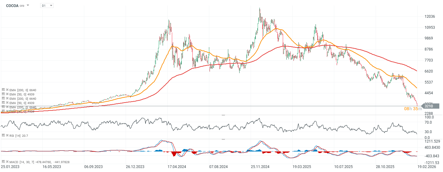 Z technického hlediska klesl denní RSI pro kakao na přibližně 20, což naznačuje extrémní přeprodané podmínky, což je pro trh s kakaem velmi neobvyklé. Širší trend však zůstává medvědí, přičemž prodejci mají pevně pod kontrolou.