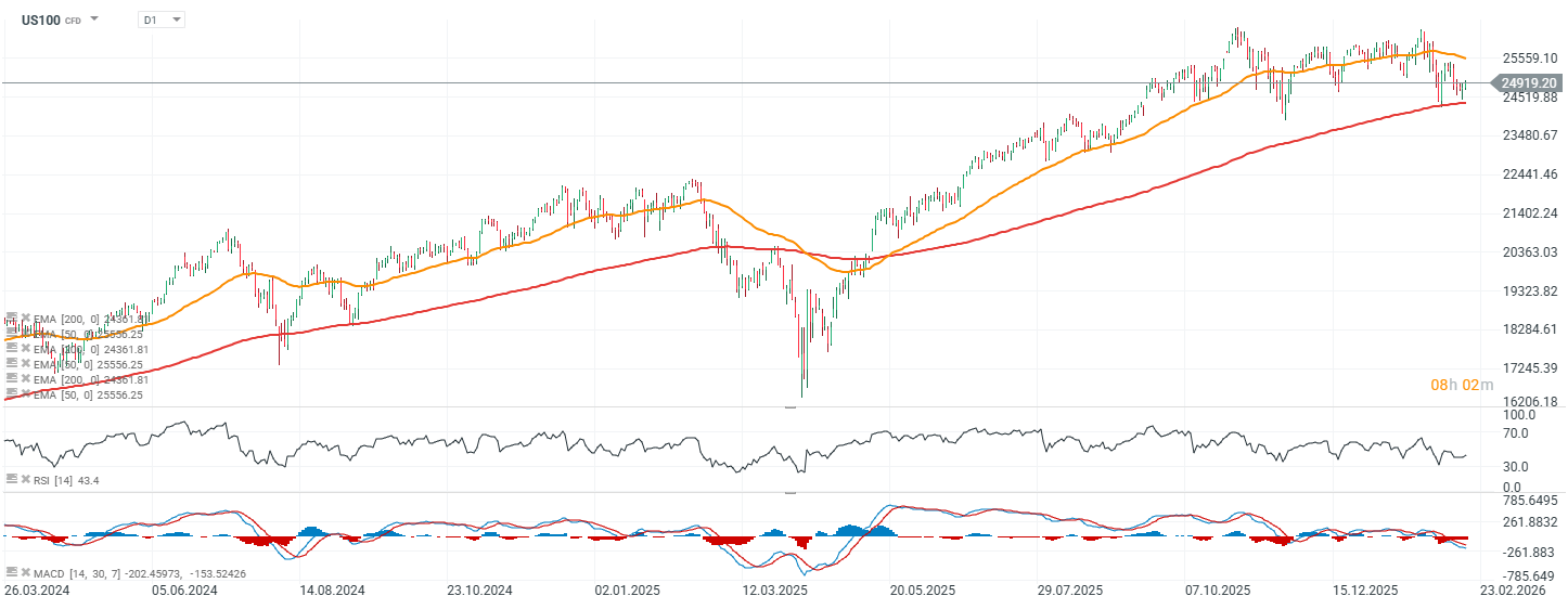 US100 dvakrát reagoval na support u 200denního exponenciálního klouzavého průměru (EMA200, červená linie) a dnes obnovuje růst. Návrat nad 25 500 bodů by mohl signalizovat trvalejší posun sentimentu směrem k býčímu nastavení.
