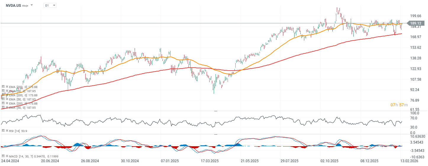 - Nvidia (NVDA.US): +1,7 % – růst po zprávách, že Meta plánuje v příštích letech nasadit „miliony“ procesorů Nvidia, což podtrhuje zrychlující tempo investic do AI a posiluje vazby mezi klíčovými hráči v sektoru.