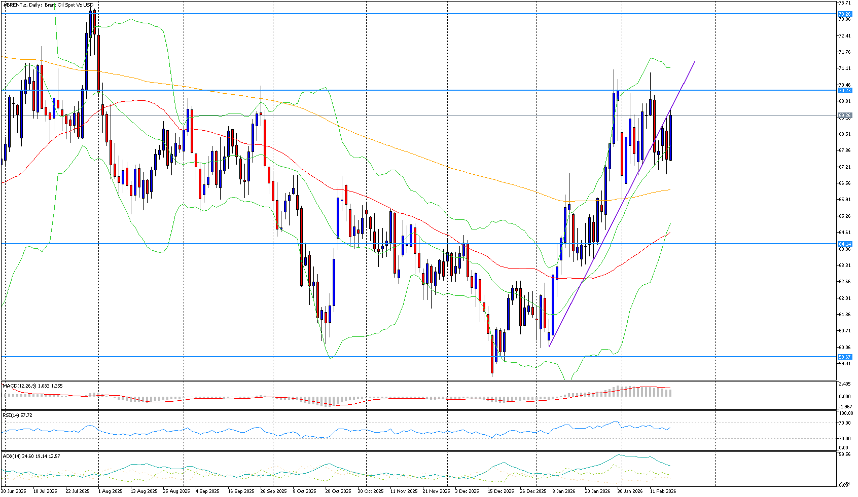 Cena ropy BRENT po včerejším výrazném poklesu o 2,1 % mírně koriguje směrem vzhůru a snaží se stabilizovat nad úrovněmi dosaženými během předchozí výprodejní seance. Od konce ledna se trh pohybuje v relativně úzkém pásmu 66,00–71,00, což naznačuje fázi konsolidace a vyčkávání na nový fundamentální impuls. Jedním z hlavních faktorů, které ovlivňují cenový vývoj, zůstává očekávání kolem jaderných jednání mezi USA a Íránem, jejichž potenciálně pozitivní výsledek by mohl mít dopad na globální nabídku ropy. Současně Írán oznámil dočasné uzavření Hormuzského průlivu ve středu v souvislosti s námořními cvičeními, což představuje geopolitický prvek schopný krátkodobě zvýšit volatilitu. Tento krok přichází v citlivém období, kdy trh pečlivě sleduje jak diplomatický vývoj, tak i případné narušení dodavatelských tras. Z technického hlediska se cena snaží dostat nad 20denní jednoduchý klouzavý průměr poblíž 68,50. Přesto zůstává pod vzestupnou trendovou linií vedenou od prosince, což omezuje prostor pro výraznější obnovení růstu. Momentum indikátory vykazují smíšený obraz. MACD se nadále pohybuje v kladném teritoriu, avšak pod svou signální linií, což naznačuje pouze mírně pozitivní dynamiku bez jasného potvrzení silnějšího růstového impulzu. RSI stagnuje kolem neutrální hranice 50, čímž odráží vyvážený poměr mezi nákupními a prodejními silami. V případě pokračování růstu by se cena mohla pokusit o rozhodný průlom pásma 69,00–70,00, které představuje bezprostřední zónu rezistence. Nad touto oblastí se nachází další klíčová překážka na úrovni 70,23, jejíž překonání by mohlo otevřít prostor k návratu k horní hraně konsolidačního rozpětí. Naopak obnovený pokles by mohl přivést trh k technicky významné oblasti 64,00, kde se koncentrují 50denní a 100denní SMA spolu s dolním Bollingerovým pásmem. Tato konfluence činí z uvedené zóny silnou podporu. V případě jejího prolomení by se další výrazná obranná hladina nacházela na 59,00, což odpovídá minimům z prosince. Celkově se BRENT snaží část včerejších ztrát korigovat, přičemž technický obraz zatím naznačuje spíše neutrální až mírně býčí nastavení. Rozhodující bude schopnost trhu vrátit se nad klíčové klouzavé průměry a pásmo rezistence 69,00–70,00.