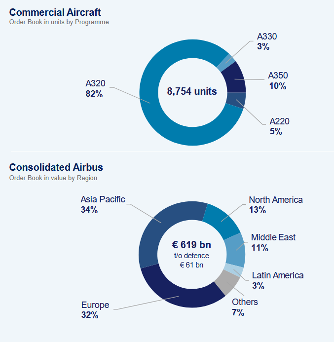 Kniha objednávek dle regionu a rozdělení knihy objednávek komerčních letadel dle programu, zdroj: Airbus
