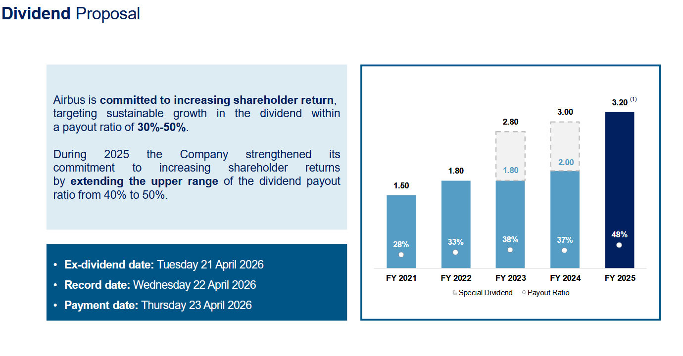 Představenstvo navrhne na valné hromadě (14. dubna 2026) výplatu dividendy za rok 2025 ve výši 3,20 EUR na akcii. Navrhované datum výplaty je 23. dubna 2026. Trh očekával dividendu 2,8 EUR.