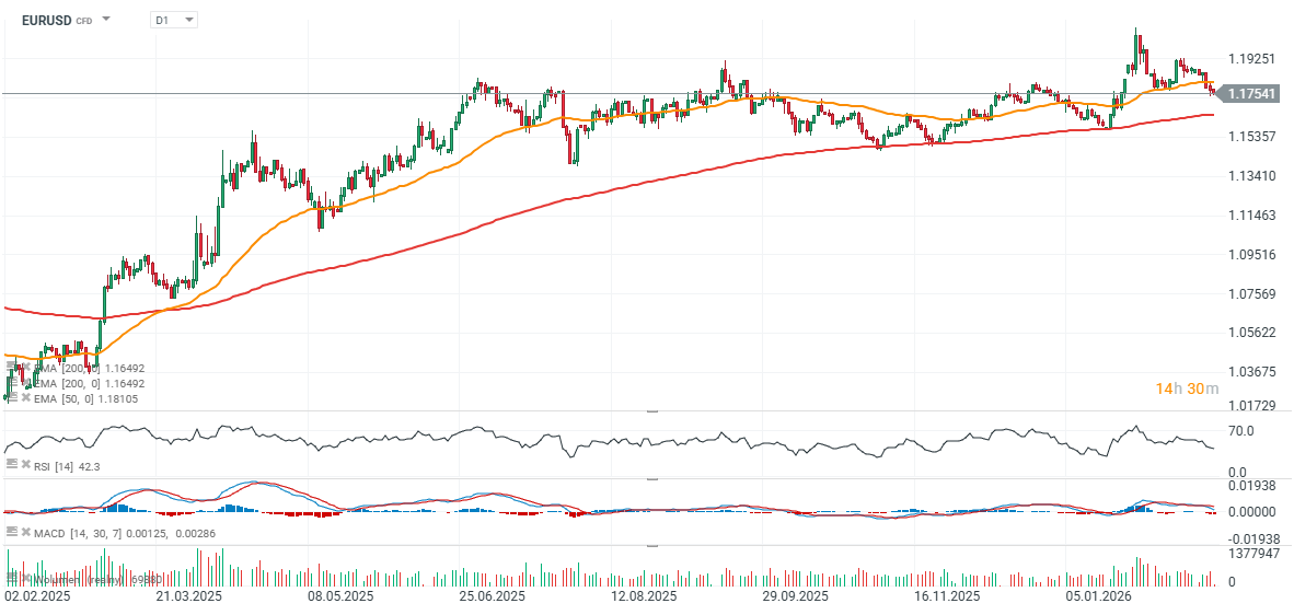 EUR/USD dnes prohlubuje svůj pokles, přičemž klíčový trendový ukazatel 200denní EMA200 se nachází poblíž úrovně 1,165. Tato hladina v poslední době třikrát fungovala jako podpora, a to dvakrát v listopadu 2025 a jednou v lednu letošního roku.