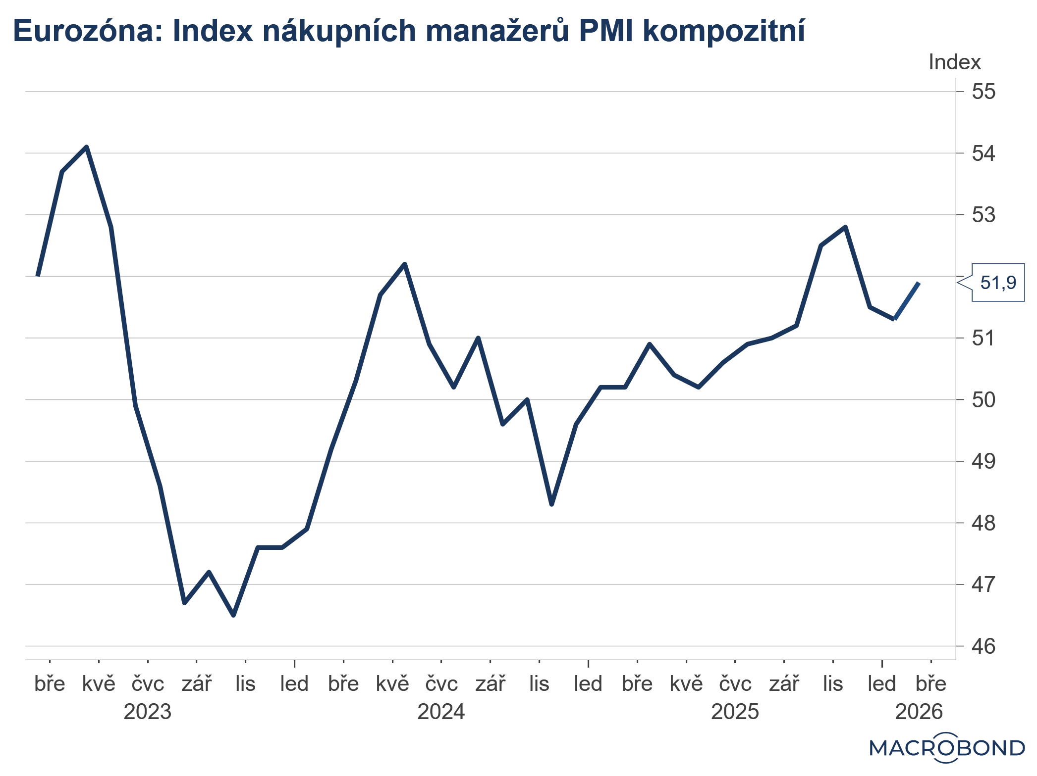 Index nákupních manažerů PMI kompozitní v březnu podle předběžných odhadů vzrostl na 50,4 b. oproti 50,2 b. v únoru. Trhy očekávaly růst na 50,7 b. -
