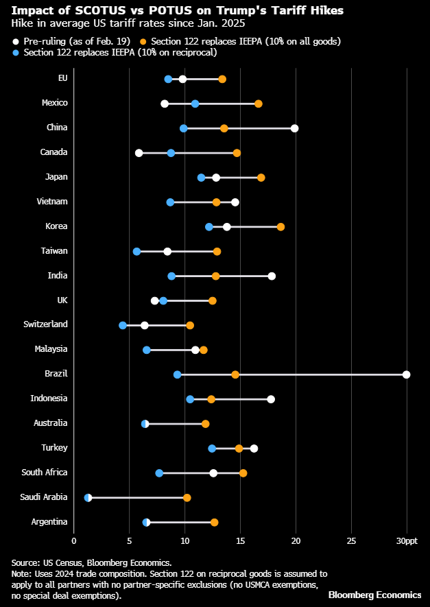 Trump včera uvedl, že daná plošná celní sazba by měla začít platit během tří dní. Zatím není jasné, zda bude platit na všechny produkty, které se do USA dováží, nebo jenom na ty, které podléhaly zneplatněnému recipročnímu clu. Trump spíše naznačuje, že se bude vztahovat na všechny produkty. V takovém případě by ovšem platilo, že průměrné navýšení cel USA na dovoz z EU by za dobu Trumpova vládnutí během druhého prezidentského mandátu, tedy od ledna 2025, představovalo 13,4 procentního bodu, namísto 9,8 procentního bodu, které platilo před včerejším verdiktem Nejvyššího soudu (viz graf Bloombergu níže). Jestliže bude ale celosvětová globální sazba ve výši deseti procent uplatněna pouze na dovážené zboží, které dosud podléhalo clu recipročnímu, Trumpovo celkové navýšené clo na dovoz z EU od ledna 2025 bude činit 8,5 procentního bodu. V takovém případě by si tedy unijní vývozci v průměru polepšili oproti dosavadnímu stavu, neboť by čelili clu celkově nižšímu.