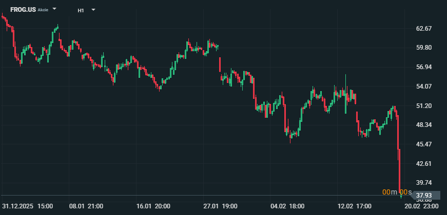 Akcie JFrog Ltd. (FROG) v pondělí ráno 23. února 2026 ztrácely zhruba 25 %. Pokles navazuje na sektorový výprodej, ve kterém investoři znovu řeší, jak rychle mohou AI platformy převzít část funkcí DevSecOps nástrojů (development, security, operations – vývoj, bezpečnost a provoz). Zdroj: xStation5
