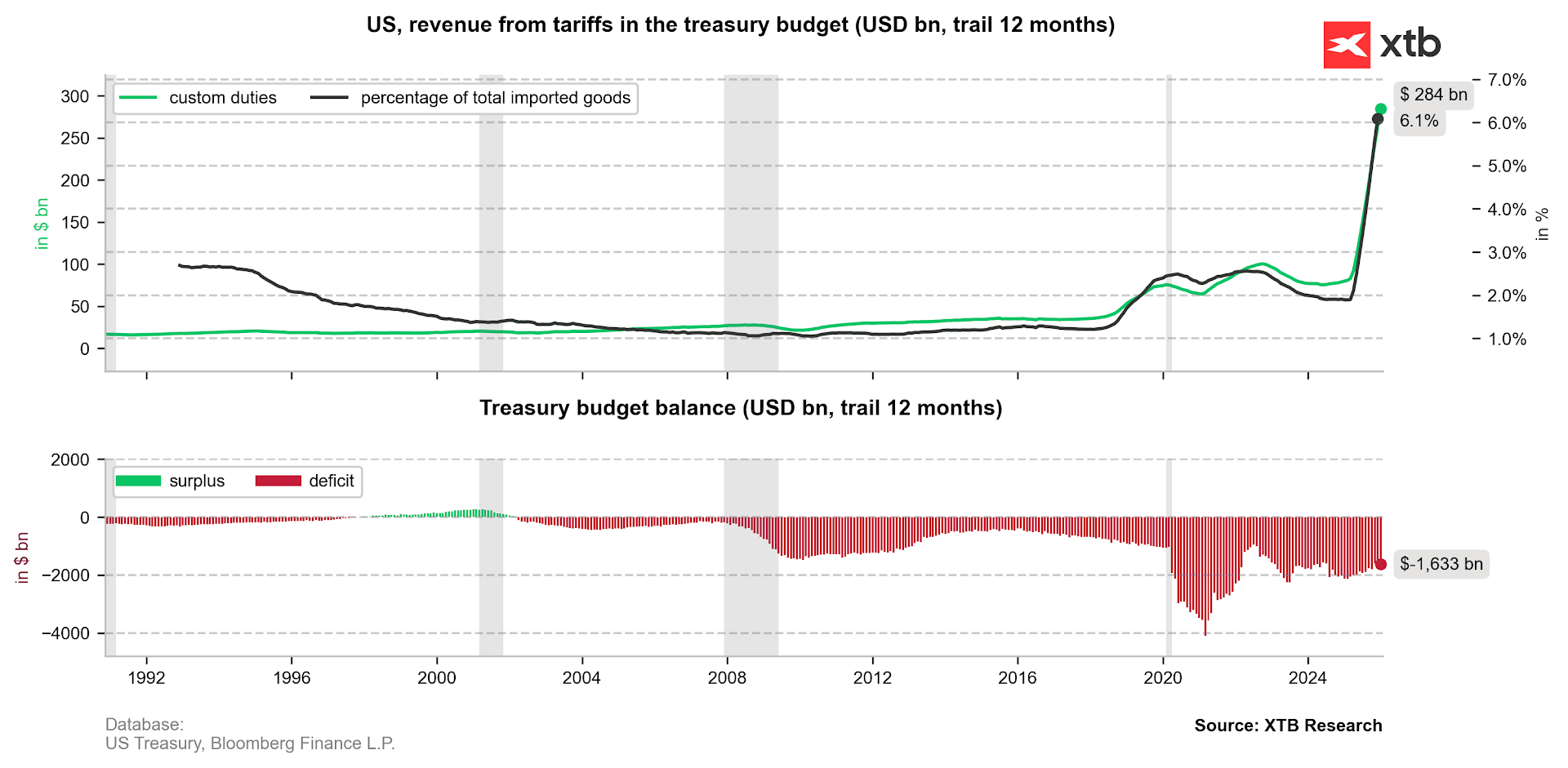 Na základě zákona IEEPA bylo vybráno nejméně 130 miliard dolarů na clech. Zdroj: Bloomberg Finance LP, XTB.