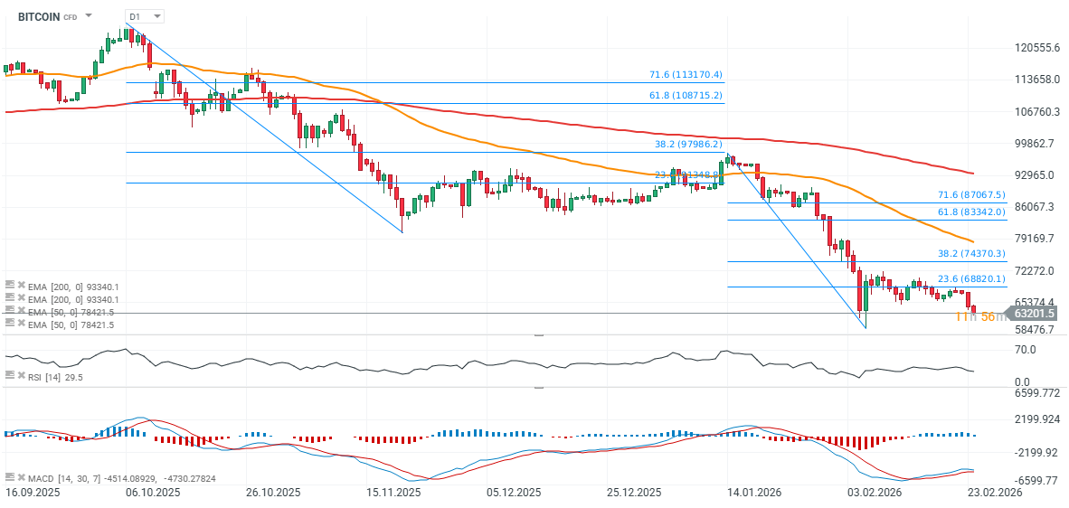 Bitcoin za poslední měsíc poklesl téměř o 30 % a propad z historického maxima poblíž 126 000 USD nyní dosáhl přibližně 50 %. Oprávňuje technická situace optimismus ohledně potenciálního oživení? Poslední býčí impuls se neudržel a cena čelila silnému prodejnímu tlaku kolem 72 300 USD poté, co se odrazila od lokálního minima o přibližně 20 %.