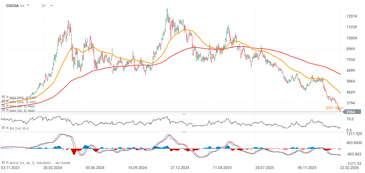 Futures na kakao (COCOA) na burze ICE dnes prudce oslabily, když ztratily více než 5 % a klesly pod hranici 3 000 USD za tunu – na úrovně nevídané od května 2023. Trh je pod tlakem chronicky slabé fyzické poptávky, výrazného zpomalení zpracování, příznivého počasí v západní Africe a vyhlídky na silnou sklizeň, což současně snižuje výnosy afrických farmářů.