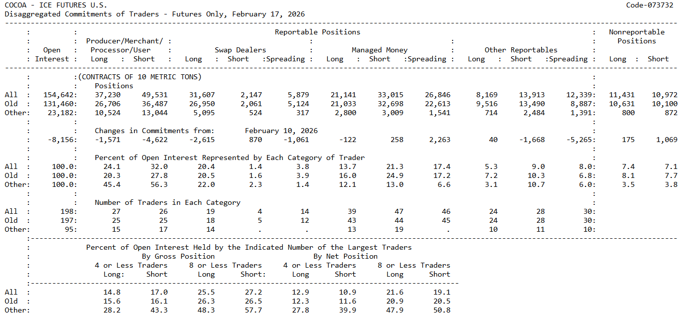 Nejnovější report CoT pro kakao naznačuje, že trh se nachází ve fázi přechodu, nikoli v bodě jasné akcelerace trendu. Klíčovou týdenní změnou je pokles otevřeného zájmu o více než 8 000 kontraktů (přibližně -5 %). To signalizuje, že část účastníků uzavřela své pozice, čímž na trhu zůstává méně „čerstvého paliva“ pro udržitelný směrový pohyb. Pokles otevřeného zájmu často doprovází ochlazení impulsu a přechod do konsolidace.