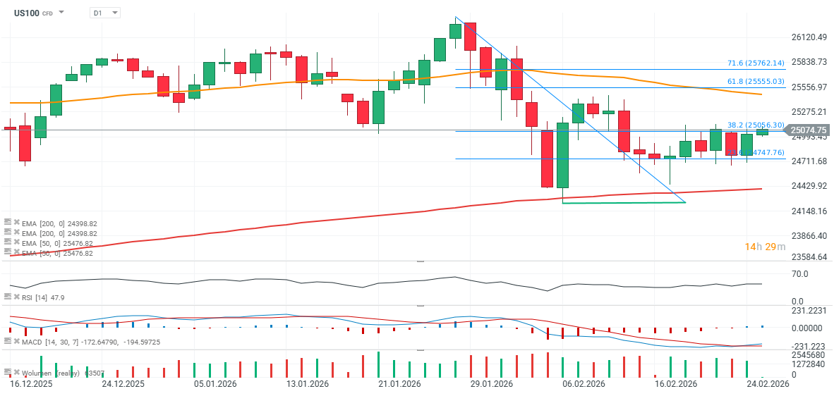 - Index se aktuálně obchoduje poblíž úrovně 38,2% Fibonacciho retracementu posledního klesajícího impulzu. Trvalé prolomení této úrovně a pohyb nad 25 150 bodů by mohly otevřít cestu směrem k 25 550 bodům, kde se nachází 61,8% retracement. Přesto je obtížné očekávat rozhodný pohyb před zveřejněním výsledků Nvidia.