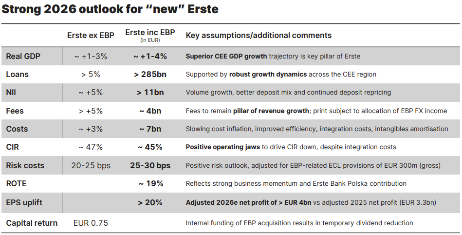 Management zveřejnil výhled na rok 2026. Očekává meziroční růst úvěrového portfolia o více než 5 % (více než 285 mld. EUR včetně Erste Bank Polska). Čisté úrokové výnosy by měly meziročně vzrůst o zhruba 5 % (více než 11 mld. EUR.). Výnosy z poplatků a provizí by měly vzrůst o více než 5 % (kolem 4 mld. EUR). EPS by mělo vzrůst o více než 20 %. Management navrhuje dividendu ve výši 0,75 EUR na akcii.