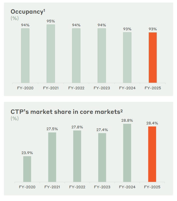Během roku 2025 podepsala společnost CTP nájemní smlouvy na 2 325 000 m2 (včetně Itálie), což představuje nárůst o 10 % v porovnání s rokem 2024, s průměrným měsíčním nájemným ve výši 5,81 EUR za m2 (2024: 5,68 EUR). Po očištění o rozdíly ve skladbě zemí vzrostlo tržní nájemné v průměru o 4 %. Tento růst podle společnosti překonává inflaci a odráží zdravou rovnováhu mezi nabídkou a poptávkou v regionu CEE (region střední a východní Evropy).
