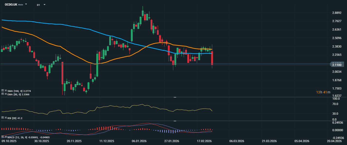 Akcie Ocado se obchodují kolem 2,11 GBP a po krátké konsolidaci zaznamenaly výrazný výprodej. Cena prudce klesla z oblasti kolem 2,35 GBP a dostala se pod oba klouzavé průměry. Aktuálně se akcie nachází pod EMA 50 (2,34 GBP) i pod SMA 100 (2,28 GBP), což potvrzuje obnovený medvědí trend. Oba průměry navíc ztrácejí růstovou dynamiku a vytvářejí rezistenční pásmo v oblasti 2,28–2,34 GBP. RSI se pohybuje pod neutrální hranicí 50, což signalizuje převahu prodejního tlaku, avšak zatím bez dosažení přeprodané oblasti.