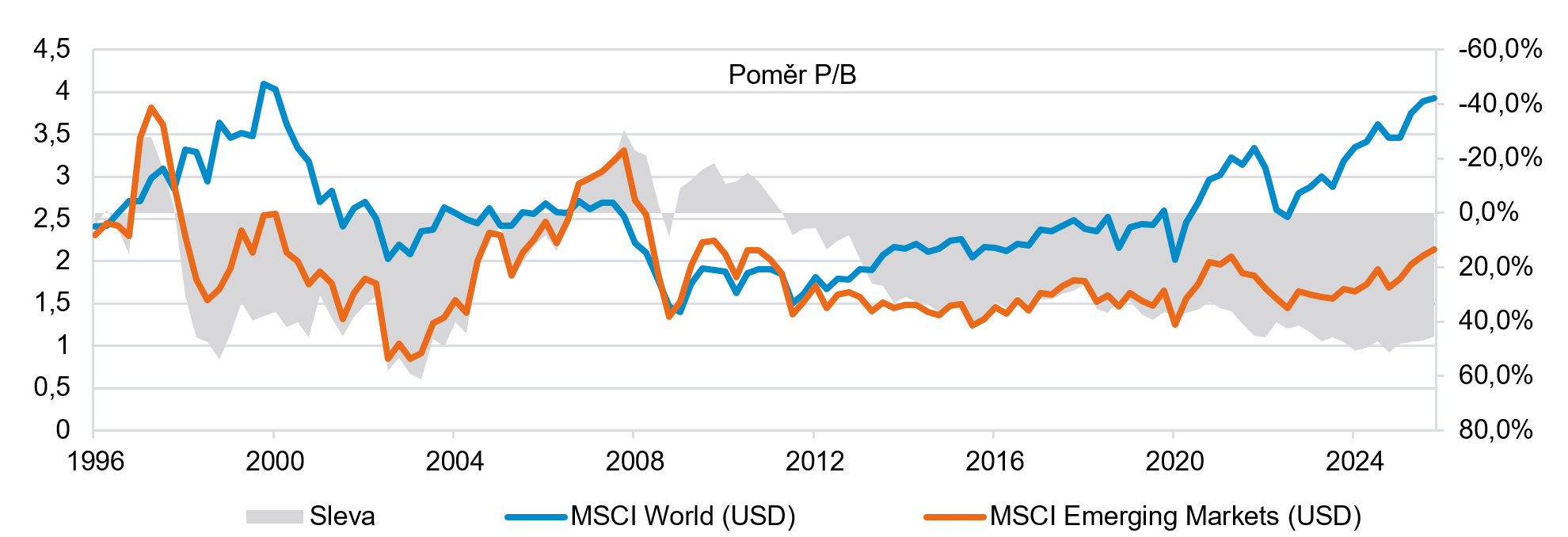 Valuace zůstávají atraktivní i přes relativní nadvýkonnost v roce 2025 Rozvíjející se trhy patřily v roce 2025 k nejvýkonnějším akciovým trhům a poprvé od roku 2017 překonaly svou výkonností USA. Z tohoto důvodu se snadno zapomíná, že trh se i nadále obchoduje s výraznou slevou oproti USA a zbytku světa (viz příloha 1). Až do konce roku 2024 region tížily problémy v Číně, prostředí strukturálně vyšších úrokových sazeb a silný americký dolar, což se projevovalo po několik dekád horší výkonností emerging markets trhů ve srovnání s rozvinutými trhy. V roce 2025 se však mnoho z těchto faktorů začalo měnit, když slabší dolar, klesající úrokové sazby, dynamika u některých významných komodit jako měď a zlato, či známky oživení v některých částech čínského trhu podpořily tuto třídu aktiv. Oporou se také stala rostoucí investorská základna, rekrutující se z řad investorů hledajících alternativy mimo USA. A vzhledem k tomu, že se dnes emerging markets stále obchodují s přibližně 40% slevou oproti zbytku světa, mohli bychom být letos svědky dalšího tržního přehodnocení směrem výše. Rozvíjející se trhy se obchodují s přibližně 40% slevou oproti zbytku světa