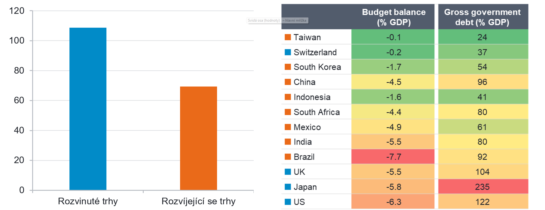Zdroj: Fidelity International, Bloomberg, 31. prosince 2025. Robustní fiskální a měnová politika Pro dosažení nadprůměrné výkonnosti rozvíjejících se trhů v roce 2026 hovoří také několik zásadních fundamentálních faktorů. Zaprvé, fiskální prostředí ve většině rozvíjejících se trhů se ve srovnání s rozvinutými zeměmi jeví jako nadále příznivé. To částečně odráží důsledky pandemie Covid-19, kdy mnoho rozvinutých trhů přijalo fiskální stimulační balíčky na podporu spotřebitelů, zatímco v mnoha rozvíjejících se trzích, zejména v Číně, došlo k opačnému vývoji, kde došlo k utahování opasků a ochlazení na trhu s nemovitostmi. V důsledku toho vypadá fiskální prostředí pro mnoho rozvíjejících se trhů mnohem zdravěji, byť s několika výjimkami, jako je Brazílie. Většina této třídy aktiv však vypadá ve srovnání s minulostí z perspektivy fiskální politiky lépe. Mnoho rozvinutých trhů sice není v až tak dobré pozici, aby mohlo provádět cílenou fiskální podporu, ve většině fiskální rozvíjejících se trhů existuje prostor pro možnost přejít v případě potřeby do expanze, což by mohlo pomoci zmírnit případná rizika zpomalujícího růstu. Fiskální prostředí vypadá lépe v rozvíjejících se ekonomikách než ve vyspělých ekonomikách