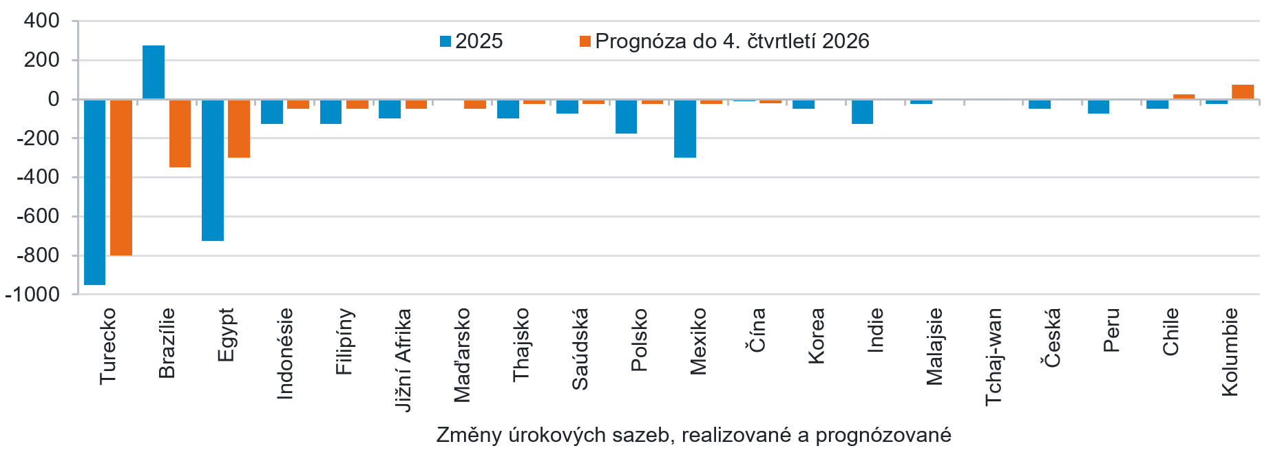Zdroj: Vlevo: Fidelity International, LSEG Datastream, IMF Fiscal Monitor, stav k říjnu 2024. Vpravo: JP Morgan, 2026 Outlook, Emerging Markets Equity Strategy, 2. prosince 2025. Naproti tomu fiskální prostředí v USA se negativně propsalo do sentimentu na americkém dolaru, který v roce 2025 výrazně oslabil. Pokud by dolar pokračoval v oslabování nebo dokonce zůstal na stejné úrovni, bylo by to pro rozvíjející se trhy příznivé, protože slabší dolar snižuje náklady na obsluhu dluhu a importovanou inflaci a podporuje ceny komodit, což posiluje místní měny a zvyšuje kupní sílu spotřebitelů. Je však třeba poznamenat, že ačkoli slabost amerického dolaru zůstává pro tuto třídu aktiv příznivým faktorem, není jediným hnacím motorem nadprůměrného výkonu rozvíjejících se trhů. Mnohé emerging markets těží ze stále sofistikovanějších kapitálových trhů, díky nimž mají méně dluhů denominovaných v dolarech než v minulosti. Nadprůměrná výkonnost rozvíjejících se trhů do budoucna tudíž nebude tolik záviset na další slabosti dolaru. V neposlední řadě většina regionu vypadá příznivě i z perspektivy měnové politiky. Mnohé rozvíjející se trhy zvýšily na počátku let 2021–2022 v boji proti inflaci úrokové sazby a reálné sazby tam zůstávají vysoké – to se týká zejména Brazílie, ale také několika dalších trhů v regionu EMEA. V důsledku toho mají mnohé z těchto rozvíjejících se trhů slušný prostor pro další uvolnění měnové politiky, pokud by Fed pokračoval ve snižování sazeb, což by mělo být vodou na mlýn pro ceny akcií. V roce 2026 existuje prostor pro snižování sazeb na mnoha rozvíjejících se trzích