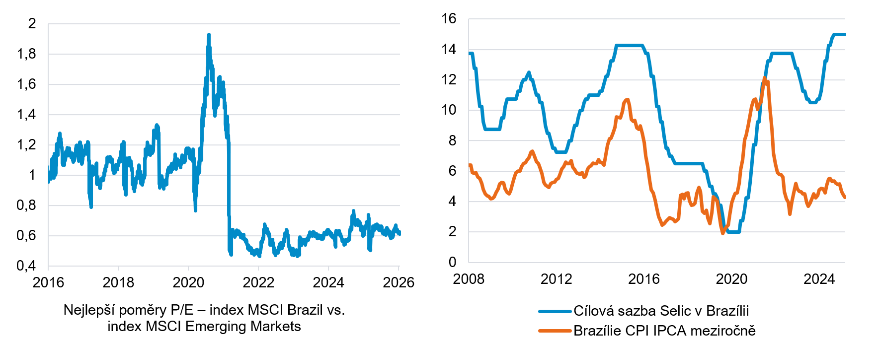 Zdroj: Bloomberg Finance L.P., prognózy JP Morgan, k 8. lednu 2025. Z pohledu snižování úrokových sazeb představuje zvláštní příležitost Brazílie. Zdejší trh zůstává levný ve srovnání s ostatními aktivy emerging markets i historií, částečně kvůli zhoršující se fiskální situaci za prezidenta Luly, která vedla centrální banku k udržování vysokých úrokových sazeb (s reálnými sazbami v dvouciferných hodnotách) za účelem ochrany měny. Potenciální světlo na konci tunelu mohou znamenat říjnové prezidentské volby, které v kombinaci s mírnější inflace znamenají, že trh již začal zaceňovat významný cyklus uvolňování měnové politiky v tomto roce. Ačkoli výsledek voleb zůstává nejistý, poměr výnosu a rizika vypadá atraktivně. Brazilský trh se nyní obchoduje s nižším násobkem než v minulosti, což značí omezený potenciál poklesu v případě pokračování současného stavu, ale významný potenciál růstu v případě výsledku příznivého pro trh. Brazílie se obchoduje s rekordní slevou (vlevo), ale začátek uvolňování sazeb může odstartovat rally (vpravo)