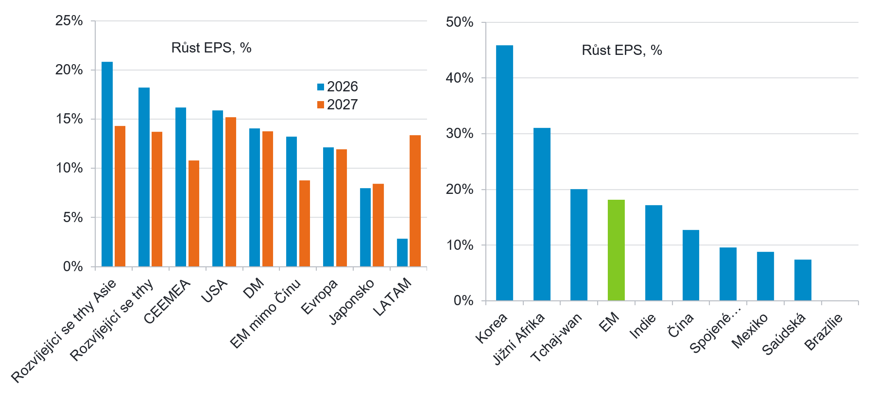 Zdroj: Vlevo: Odhady Bloomberg BEst, k 14. lednu 2025. Vpravo: Bloomberg, k 31. prosinci 2025. Silné prognózy pro růst zisků díky technologiím a komoditním trhům Výhled růstu zisků vypadá pro rozvíjející se trhy také pozitivně. Konsensus odhadů předpokládá zrychlení růstu zisků rozvíjejících se trhů v roce 2026 na 18,2 %, což je výrazný náskok oproti rozvinutým trhům a USA a vypadá obzvláště atraktivně vzhledem k valuačnímu diskontu emerging markets. Ačkoli jsou faktory podporující tyto odhady jsou rozmanité, jak ukazuje níže uvedený rozpis podle zemí, klíčovými hybateli jsou trhy s vysokým podílem technologií, jako je Tchaj-wan a Korea, a země ekonomiky závislé na komoditách, jako Jihoafrická republika. Emerging markets se těší lepší prognóze růstu zisků ve srovnání s rozvinutými trhy