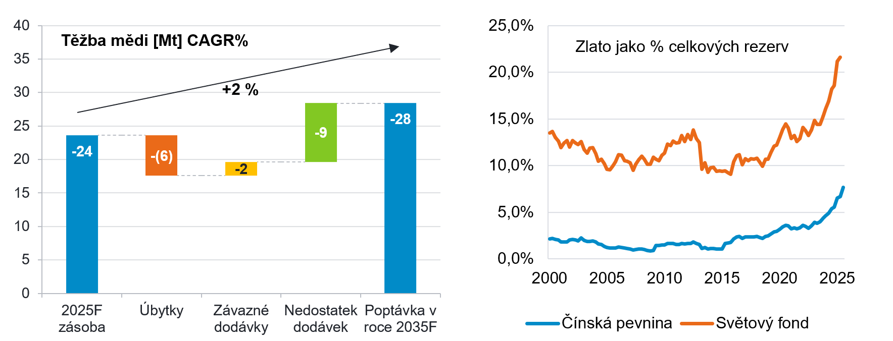 Zdroj: Bloomberg, k 15. září 2025. Jedním z příkladů tohoto jevu jsou výrobci ethernetových rozbočovačů (switchů), vstupních zařízení do datových center, kde tchajwanská společnost Accton konkuruje americké společnosti Celestica. Ačkoli mají obě společnosti téměř identické provozní modely, Accton má lepší fundamenty a růst tržeb a užší vztah s koncovým zákazníkem (TSMC), což se odráží v hlubší integraci do jeho dodavatelského řetězce. Navzdory tomu se obchoduje za přibližně polovinu násobku společnosti Celestica, což ukazuje na hodnotové příležitosti, které se nabízejí v oblasti technologií rozvíjejících se trhů. Příznivý vývoj u komodit Dalším klíčovým faktorem pro aktiva na rozvíjejících se trzích je stále příznivější situace u cen komodit, kdy by mohlo pokračovat posilování klíčových těžebních komodit, jako je měď a zlato, přičemž ceny ropy by měly zůstat na nízké úrovni. Nejlépe vypadá situace u mědi. Zde se strukturálně silnější poptávka po tomto kovu, poháněná elektromobily, rostoucím využíváním datových center a elektrifikací, spojuje s klesající nabídkou v důsledku nedostatku nových projektů na zelené louce a klesající kvality dolů. Pokud jde o zlato, trh sice již ušel dlouhý kus cesty a cenové pohyby jsou tu zároveň mnohem nepředvídatelnější než u komodity jako měď, zdá se však, že mnoho pozitivních faktorů pro tento drahý kov zůstává ve hře, vzhledem k pokračující podpoře ze strany centrálních bank. Ty se snaží diverzifikovat své investice mimo americké státní dluhopisy, přičemž zlato na trzích jako Čína zůstává na nízkém podílu celkových rezerv. Situace v oblasti nabídky a poptávky po mědi vypadá pozitivně (vlevo), zatímco potenciál dalšího růstu podílu zlata na celkových rezervách může i nadále podporovat jeho ceny (vpravo).