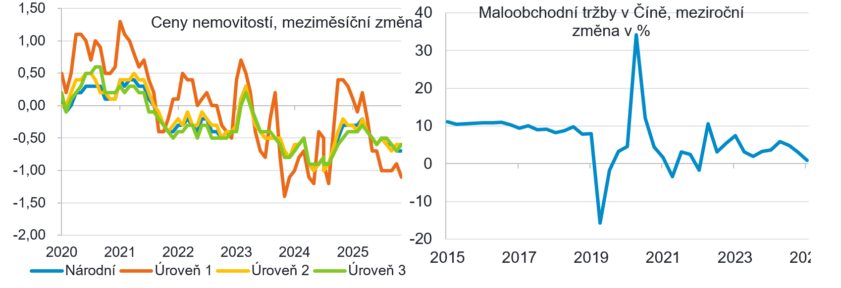 Zdroj: Vlevo: Rio Tinto Capital Markets Day, 4. prosince 2025. Vpravo: Fidelity International, příslušné centrální banky, World Gold Council, k 30. září 2025. Silná pozice drahých a průmyslových kovů je pozitivní pro emerging markets vyvážejících komodity, kde těžařské společnosti tvoří velkou část akciových trhů, jako je Peru a Chile (měď) a Jižní Afrika (zlato). Vzhledem k tomu, že těžební společnosti jsou obvykle významnými zaměstnavateli, mělo by to mít pozitivní dopad i na spotřebitele na těchto trzích. Dalším impulsem pro tuto třídu aktiv může být pesimistický výhled pro ropu, podpořený nadbytečnou kapacitou OPEC a růstem nabídky z trhů jako Brazílie, který podpoří běžné spotřebitele prostřednictvím nižších nákladů na energie, protože v emerging markets ekonomikách ropa tvoří významnou část spotřebního koše. Pozitivní signály v Číně: průmysloví inovátoři Nakonec je třeba samostatně zvážit Čínu, vzhledem k jejímu značnému podílu v indexu rozvíjejících se trhů. Situace je zde složitá a výhled pro spotřebitele zůstává nejistý. Ačkoli jsme byli svědky přechodu vlády k expanzivní politice, která zahrnuje snižování úrokových sazeb a cílené balíčky stimulačních opatření zaměřených na podporu spotřeby, stimulační opatření, jako byly loňské dotace na obměnu starých vozidel, nyní končí a trh s nemovitostmi zůstává slabý. Růst cen nemovitostí je i nadále v záporných číslech a ačkoli se nadměrné kapacity na trhu stabilizovaly, dosud neklesly. Vzhledem k tomu, že historicky bylo přibližně 60 % majetku čínských domácností vázáno na nemovitostním trhu, je nepravděpodobné, že by došlo k oživení spotřeby, dokud se trh nezotaví. Ceny nemovitostí jsou stále v záporných číslech (vlevo), což podkopává slabou spotřebitelskou důvěru (vpravo)