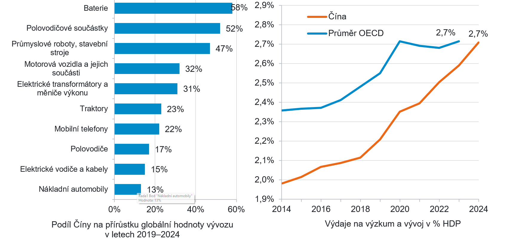 Zdroj: Vlevo: Národní statistický úřad, Fidelity International, 30. listopadu 2025. Vpravo: Bloomberg, 19. ledna 2026. Na trhu se však objevují i některé pozitivní signály, zejména v několika rozvíjejících se průmyslových odvětvích, kde čínské společnosti rychle inovují. Existuje několik klíčových oblastí, ve kterých se Čína posouvá v hodnotovém řetězci výše, včetně nejrychleji rostoucích exportních segmentů světa, jako baterie, polovodičové součástky a roboti. Zde platí, že rostoucí výdaje na výzkum a vývoj v kombinaci s velkou zásobou kvalifikovaných talentů – Čína má nejvyšší podíl absolventů terciárního vzdělávání v oboru STEM na světě – pohání inovace a napomáhá růstu tržního podílu. Čína získává podíl v rychle rostoucích exportních odvětvích (vlevo) díky výdajům na výzkum a vývoj (vpravo)