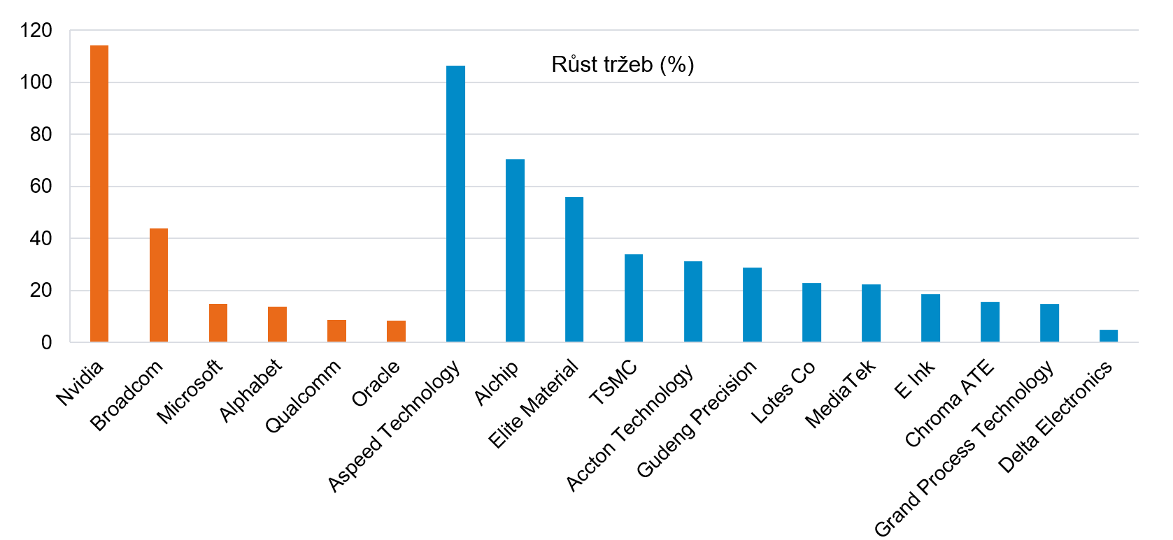 Zdroj: JP Morgan, odhady IBES, k 8. lednu 2025 Rozvíjející se trhy: Srdce dodavatelského řetězce AI Dalším faktorem, který v posledních letech poháněl růst amerických trhů, byl samozřejmě optimismus ohledně AI. Přehlížena však byla skutečnost, že většina dodavatelského řetězce AI se nachází na rozvíjejících se trzích, jako je Tchaj-wan a v menší míře Korea. Společnost Nvidia například jasně uvedla, že bez tchajwanské polovodičové továrny TSMC, na kterou se spoléhá při výrobě svých grafických procesorů, by nebyla tím, čím je dnes. V Koreji zase sídlí dva ze tří největších světových výrobců pamětí (Samsung Electronics a SK Hynix), což je typ hardwaru nezbytný pro čipy AI a datová centra, který se těší silné poptávce a nabídce. Je pravděpodobné, že velká část hodnoty vytvořené umělou inteligencí a datovými centry připadne společnostem z rozvíjejících se trhů, a vidíme významnou příležitost k získání expozice vůči těmto technologickým společnostem, které jsou nezbytné pro AI dodavatelský řetězec a které často nabízejí vyšší růst tržeb než mnoho amerických technologických společností při mnohem levnějších násobcích. Mnoho tchajwanských společností nabízí vyšší růst tržeb, ale obchoduje se za levnější násobky než s americkými technologickými společnostmi